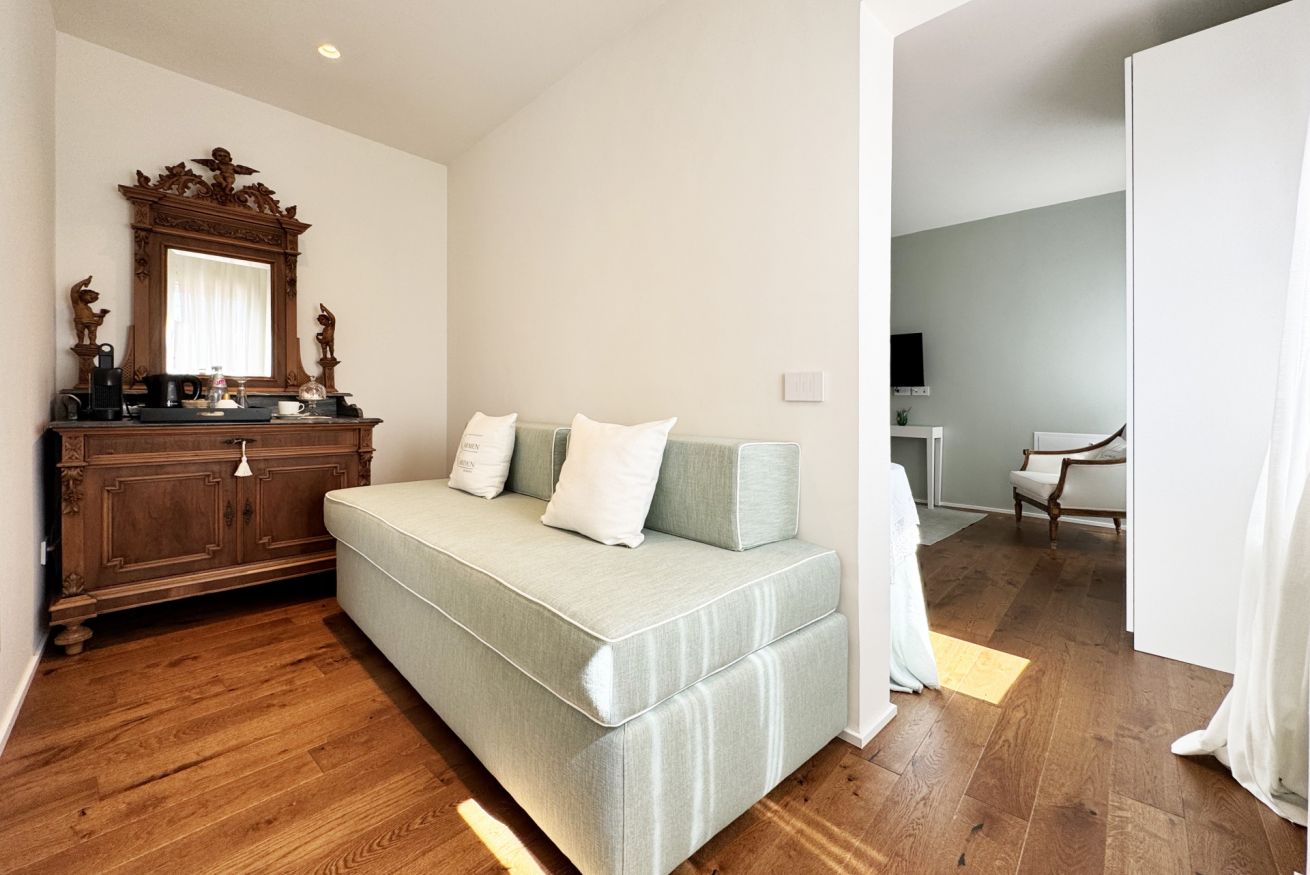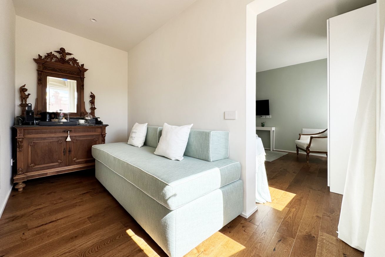 La suite Rosa è composta da una camera matrimoniale, un disimpegno con un divano letto ed un bagno completo.